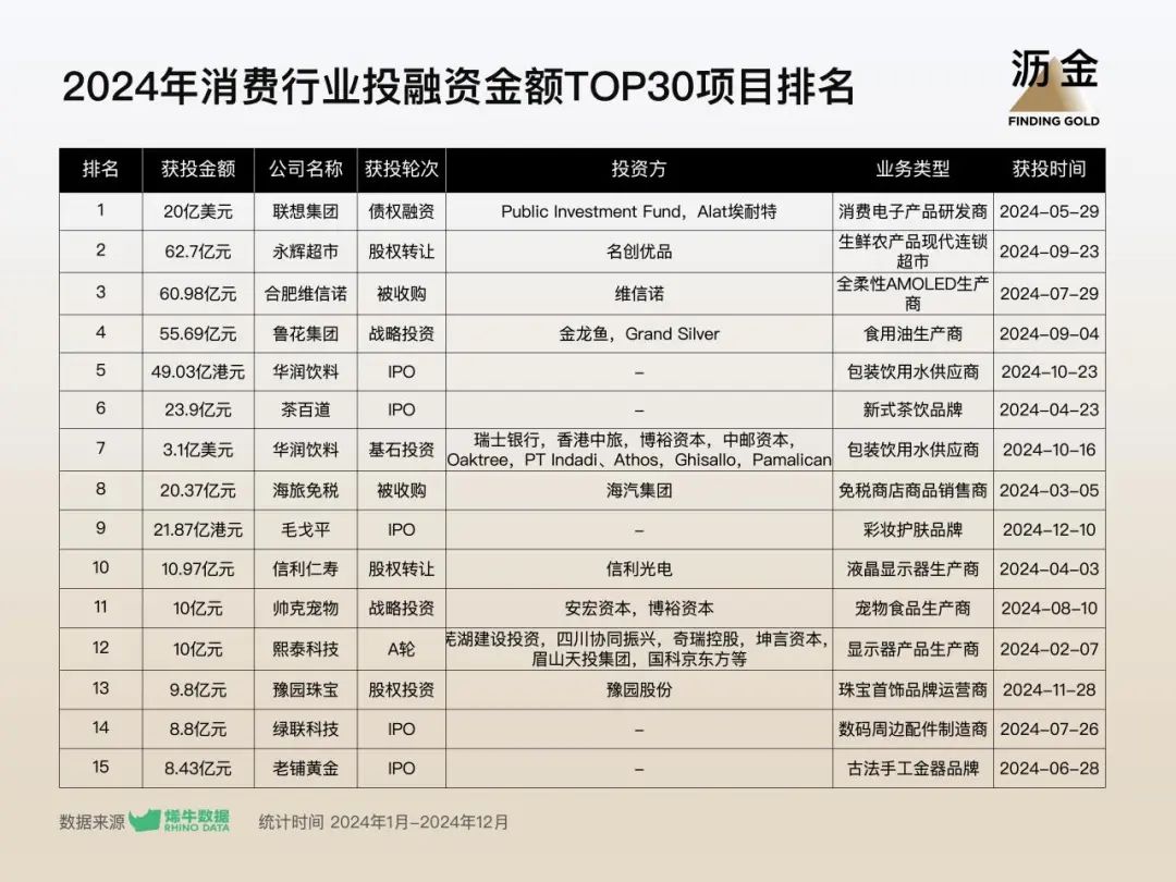2024年消費行業(yè)投融資金額TOP30項目排名