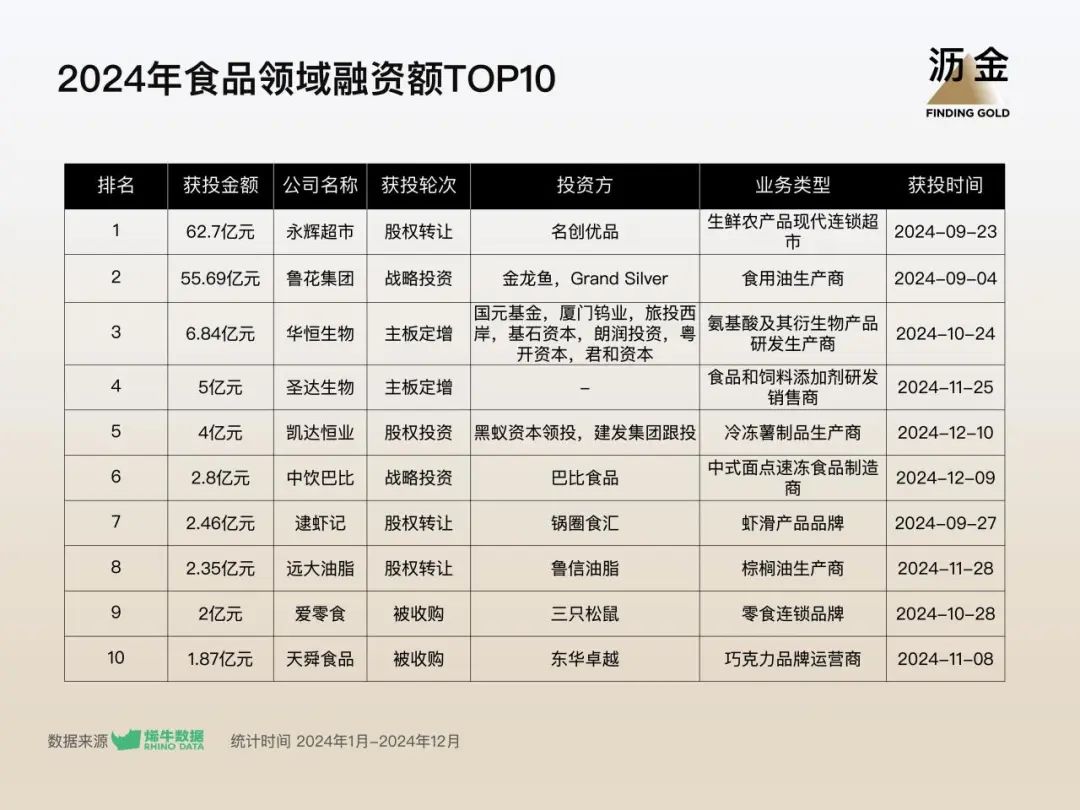 2024年,食品的巨額融資主要為生鮮超市、食用油企業(yè),融資金額分別達到62.7億元、55.69億元。
