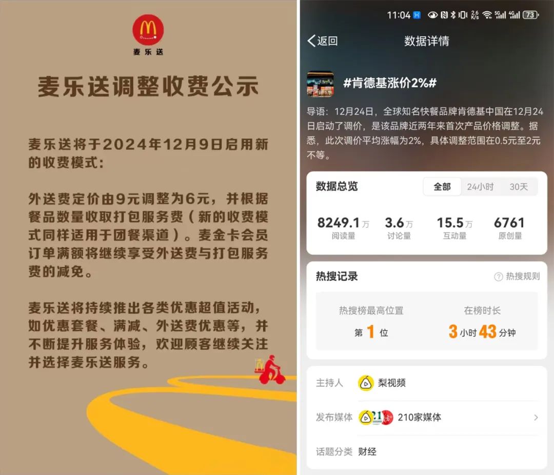 沒過多久,#肯德基漲價(jià)2%#話題沖上微博熱搜。據(jù)悉這是品牌近兩年來首次產(chǎn)品價(jià)格調(diào)整,調(diào)價(jià)平均漲幅為2%,具體調(diào)整范圍在0.5元至2元不等?系禄嚓P(guān)負(fù)責(zé)人表示,結(jié)合運(yùn)營成本變化,公司會定期評估謹(jǐn)慎調(diào)整價(jià)格結(jié)構(gòu),本次調(diào)價(jià)舉措是基于市場挑戰(zhàn)和機(jī)遇,旨在繼續(xù)為消費(fèi)者提供性價(jià)比高的用餐選擇。‘瘋狂星期四’特惠和‘周日瘋狂拼’活動等優(yōu)惠套餐維持原價(jià)。