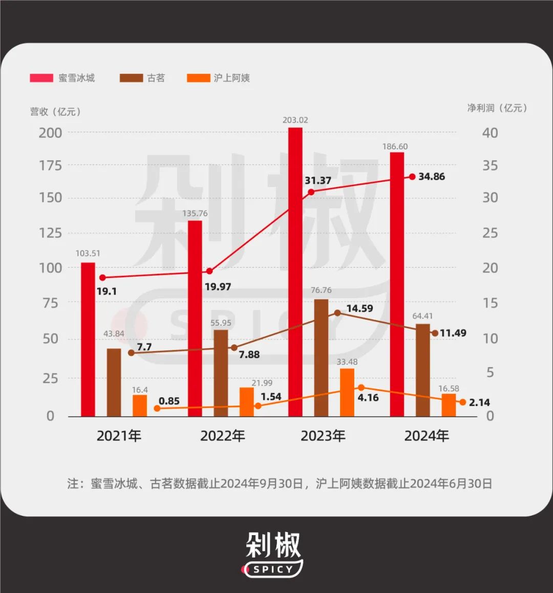 同樣,在營(yíng)收和凈利潤(rùn)等方面,古茗和滬上阿姨也無(wú)法和“雪王”相提并論。