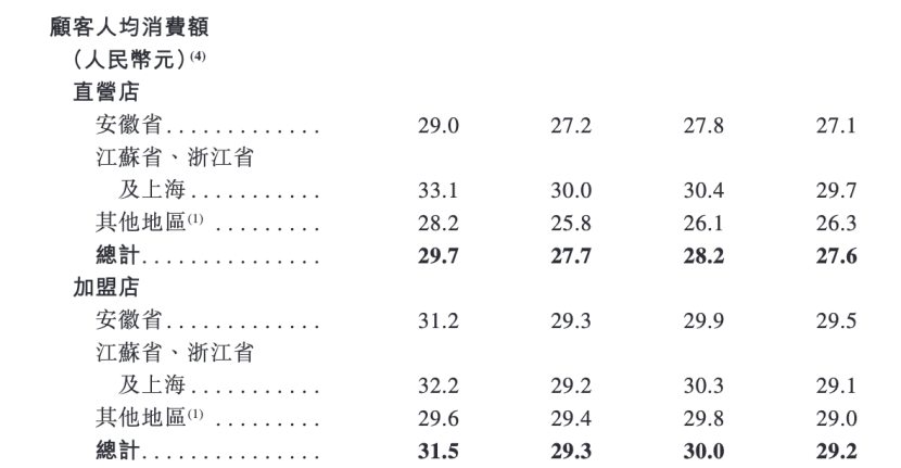 從區(qū)域看,安徽是近三年品牌加盟店的營收主力區(qū)域,其它地區(qū)的加盟店銷售額也在逐年上升。江蘇、浙江和上海在2024年前三季度的客群大幅提升,達2101.8萬人,為加盟店歷史最高。
