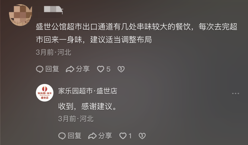 在@家樂園小總裁 的抖音評(píng)論區(qū)里,經(jīng)?梢钥吹椒劢z反饋近期在家樂園超市的購(gòu)物體驗(yàn)。對(duì)應(yīng)門店的抖音賬號(hào),會(huì)直接線上回應(yīng)或給予解決方案,儼然將賬號(hào)評(píng)論區(qū)變成了超市的售后服務(wù)平臺(tái)。