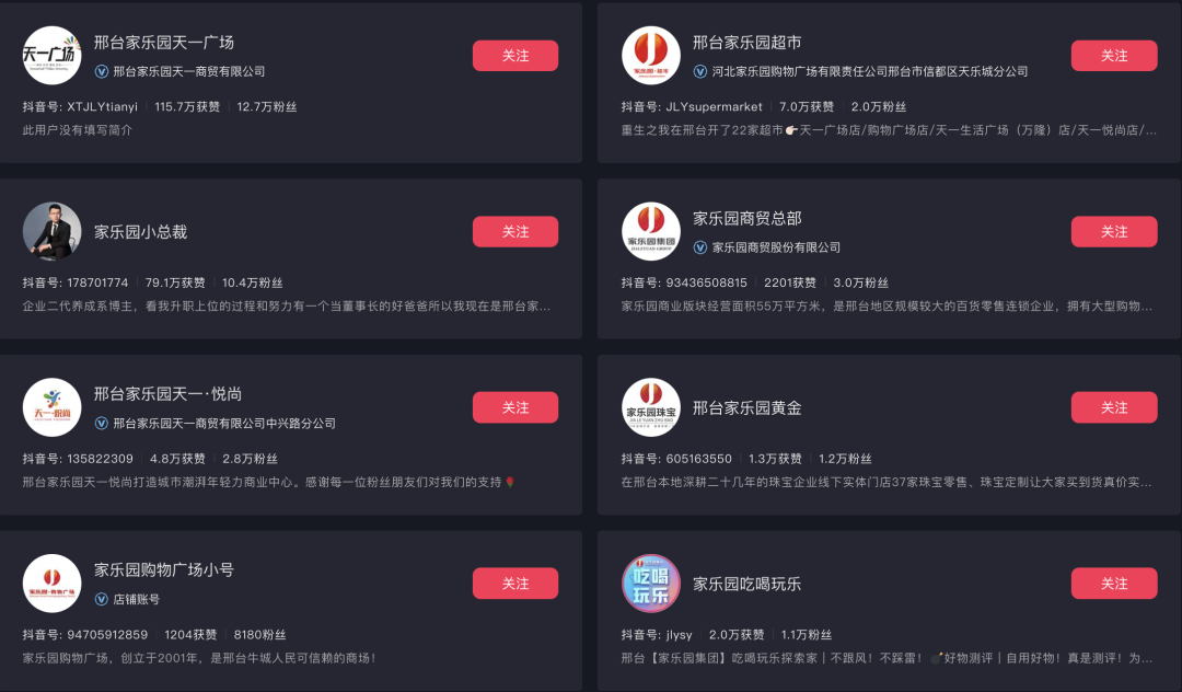 家樂園就是第一波吃到“精準(zhǔn)流量”的商超。在“企二代”廖青川的帶動(dòng)下,公司不僅在抖音開啟了有聲有色的直播間,還帶動(dòng)多位店長(zhǎng)、員工開啟線上嘗試,運(yùn)營(yíng)了幾乎覆蓋了邢臺(tái)所有家樂園線下商業(yè)門店,以及商場(chǎng)、超市等不同業(yè)務(wù)的賬號(hào)。