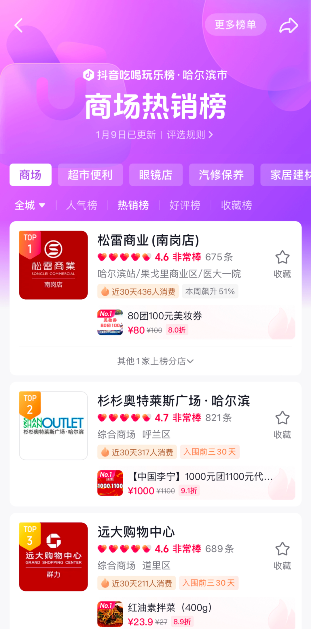 *松雷商場(chǎng)登上“抖音哈爾濱市商場(chǎng)熱銷榜第1名”