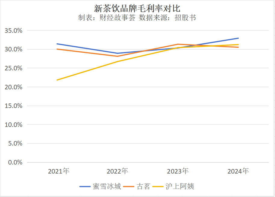 不過,整體來看,蜜雪冰城的毛利率與其他玩家并無明顯差距。報告期內(nèi),蜜雪冰城的毛利率分別為31.4%、28.9%、30.3%及32.9%,略有波動,近三年有所回暖。古茗分別為30.0%、28.1%、31.3%及30.5%,整體略有下降。滬上阿姨的數(shù)據(jù)截至2024年前6個月,期間其毛利率一直在增長,從“差生”追趕至行業(yè)平均水平,分別為21.8%、26.7%、30.4%及31.2%。
