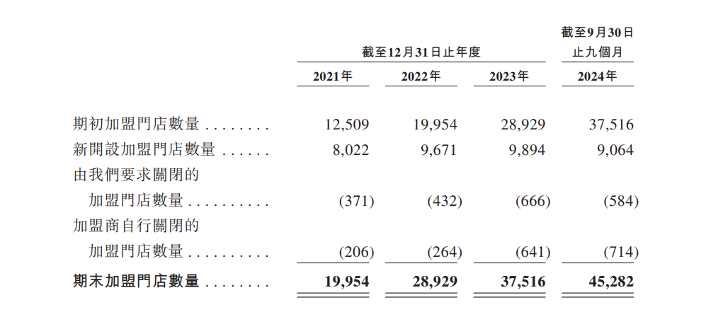 招股書顯示,2021年至2024年前9個月,蜜雪冰城關閉的加盟門店數(shù)量分別為577家、696家、1307家及1298家。其中,加盟商自行關閉的加盟店數(shù)量持續(xù)增加,分別為206家、264家、641家、714家。雖然數(shù)量在增加,但關閉門店在其整體門店中的占比并不高。
