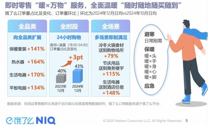 報告顯示,12月以來,餓了么上熱水器、保暖套裝外賣量日均環(huán)比(10月)分別增長164%和141%,夜間凌晨訂單占比較往年增長3個百分點,送往酒店、商務(wù)樓等多場景的訂單環(huán)比也均較為顯著。在冬暖需求驅(qū)動下,提供全品類、全時段和全場景服務(wù)的餓了么等即時零售平臺成為了激活冬季消費的重要引擎,也為更多品類發(fā)展帶來新的機遇。