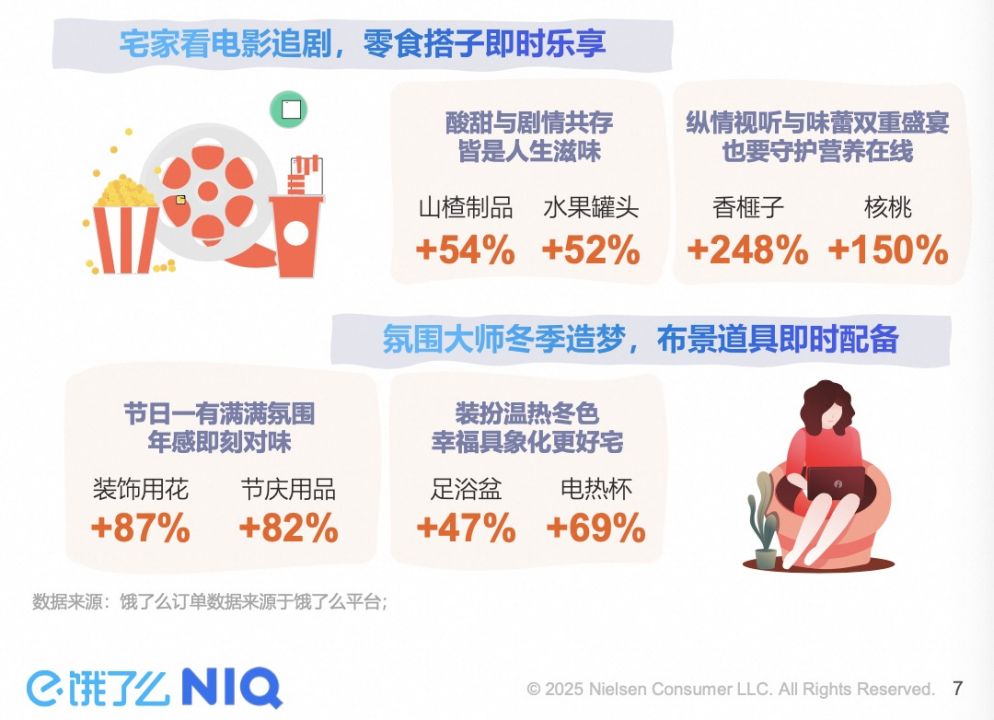 依賴即時零售一鍵下單直送,冬天宅家的幸福感不降反增。不論是一天五餐的日常暖胃,還是團聚、節(jié)日歡慶場景,均直接帶動熱飲、酒水、零食等外賣訂單環(huán)比增長。報告顯示,12月以來,餓了么上沖飲奶茶、松露巧克力、核桃等外賣量均環(huán)比增長超過100%,火鍋餃等食材、紅葡萄酒、足浴盆等宅家氛圍好物外賣量也均環(huán)比增長超過40%。