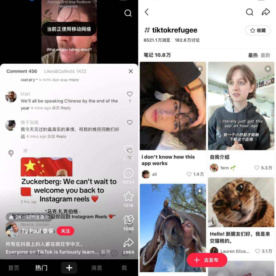四處尋找“平替”的美國年輕人不得不將目光投向了小紅書,他們自稱TikTok難民。截止發(fā)稿,小紅書#TikTokRefugee話題瀏覽量已經(jīng)超過7800萬,討論量超過200萬,一時間小紅書充斥了美國人,不少網(wǎng)友直呼仿佛來到了Instagram。