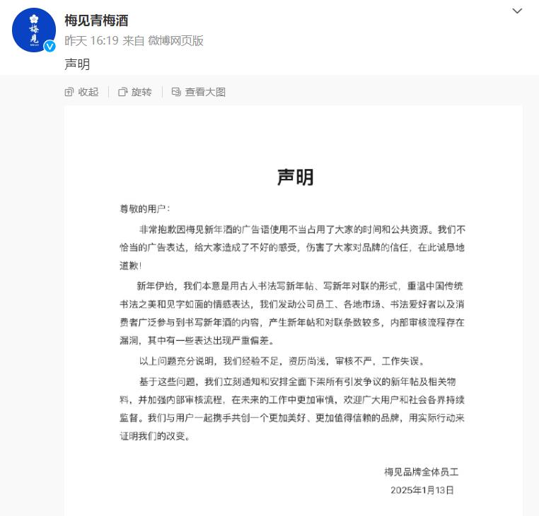 1月13日下午,梅見青梅酒官方賬號就此事發(fā)布了聲明。梅見在聲明中表示,“我們本意是用古人書法寫新年帖、寫新年對聯(lián)的形式,重溫中國傳統(tǒng)書法之美和見字如畫的情感表達,我們發(fā)動公司員工、各地市場、書法愛好者以及消費者廣泛參與到書寫新年酒的內(nèi)容,產(chǎn)生新年帖和對聯(lián)條數(shù)較多,內(nèi)部審核流程存在漏洞,其中有一些表達出現(xiàn)嚴重偏差”。梅見承認審核不嚴,工作失誤,表示將立刻通知和安排全面下架所有引發(fā)爭議的新年帖及相關物料,并加強內(nèi)部審核流程,聲明署名為“梅見品牌全體員工”。