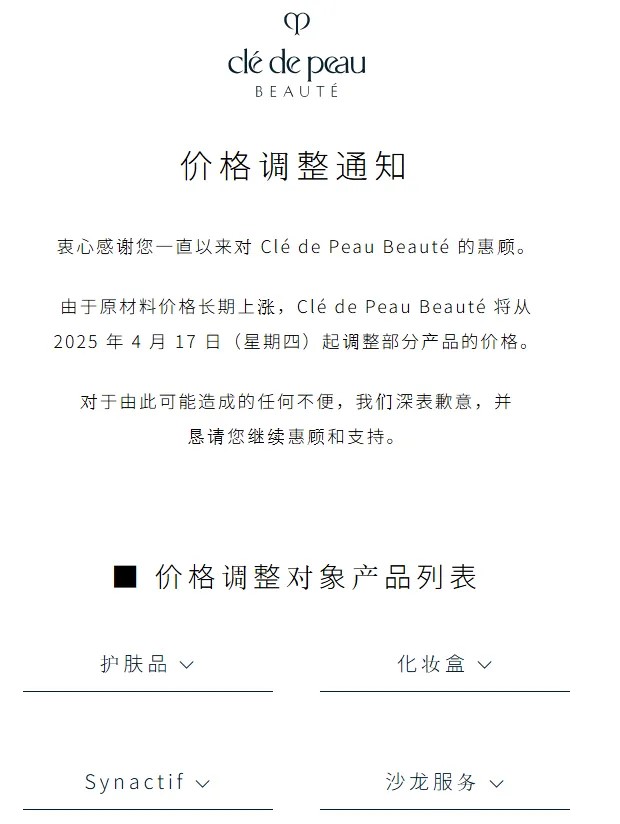 近日,資生堂品牌官方發(fā)布通知:從2025年4月17日開始,由于原材料等價格飆升,將修改部分產(chǎn)品的價格。