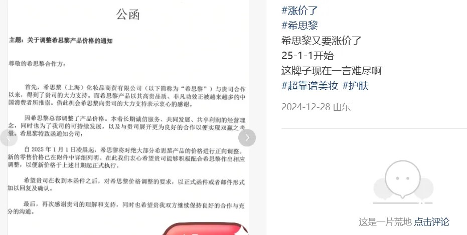另外,在小紅書平臺上,有消費者發(fā)帖稱,香奈兒、愛馬仕等奢侈品美妝線將于今年1月1日起陸續(xù)開始漲價;希思黎Sisley、紀(jì)梵希美妝等也被曝漲價。
