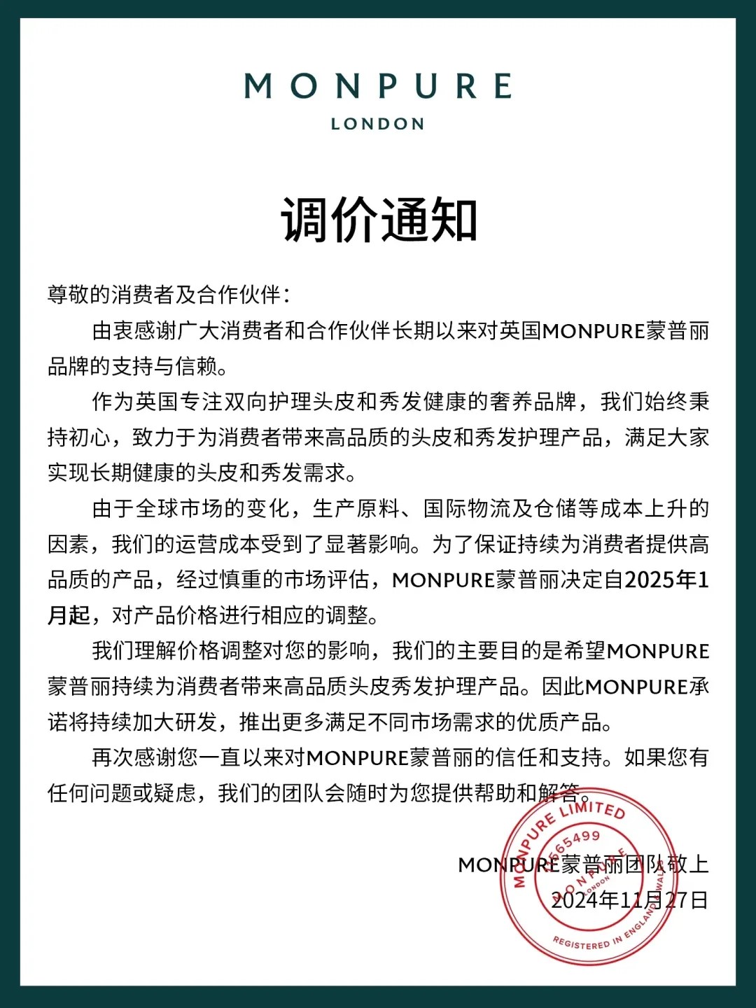 英國頭皮護理品牌Monpure,最近在官方小紅書賬號發(fā)布調(diào)價通知:由于全球市場的變化,生產(chǎn)原料、國際物流及倉儲等成本上升的因素,運營成本受到了顯著影響。為了保證持續(xù)為消費者提供高品質(zhì)的產(chǎn)品,經(jīng)過慎重的市場評估,Monpure決定自2025年1月1日起,對產(chǎn)品價格進行相應(yīng)的調(diào)整。