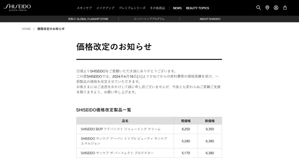 2024年1月,資生堂品牌在日本官網(wǎng)發(fā)布漲價公告,表示由于原材料成本上漲,于2024年4月16日調(diào)整部分產(chǎn)品的價格,涉及27個產(chǎn)品。其中,SHISEIDO光透耀白凝霜零售價漲幅13.3%,SHISEIDO盼麗風(fēng)姿精華液價格漲幅8.7%。