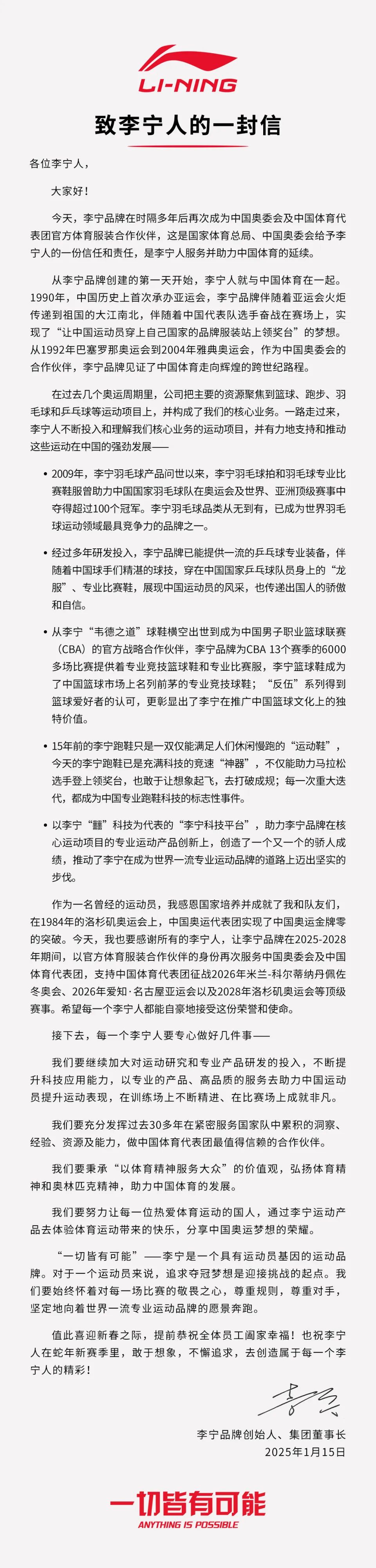 李寧在信中指出,李寧是一個具有運動員基因的運動品牌!案兄x所有的李寧人,讓李寧品牌在2025至2028年期間,以官方體育服裝合作伙伴的身份再次服務(wù)中國奧委會及中國體育代表團(tuán),支持中國體育代表團(tuán)征戰(zhàn)2026年米蘭——科爾蒂納丹佩佐冬奧會、2026年愛知·名古屋亞運會以及2028年洛杉磯奧運會等頂級賽事。希望每一個李寧人都能自豪地接受這份榮譽和使命!