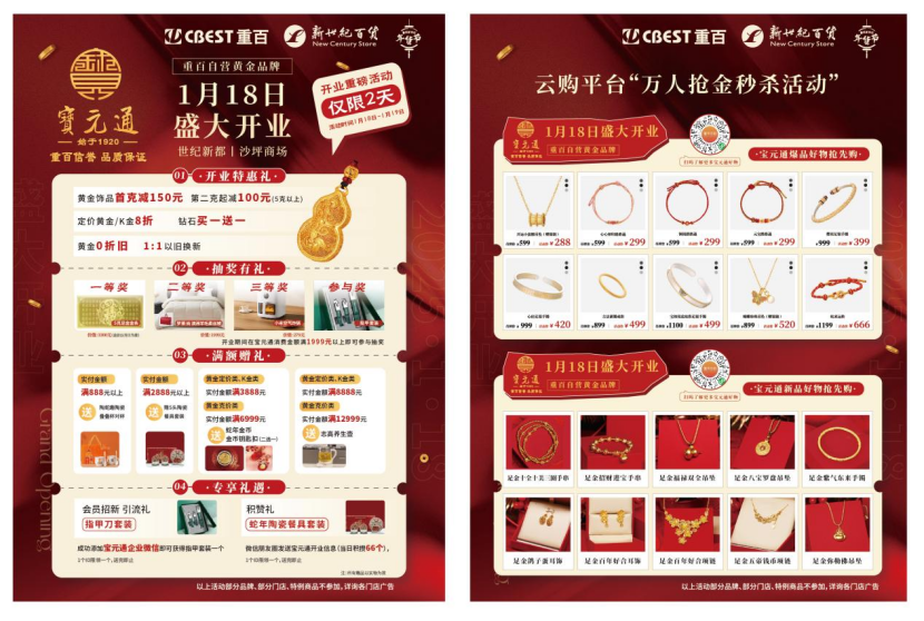 重慶百貨自營黃金品牌”寶元通“首店1月18日開業(yè)