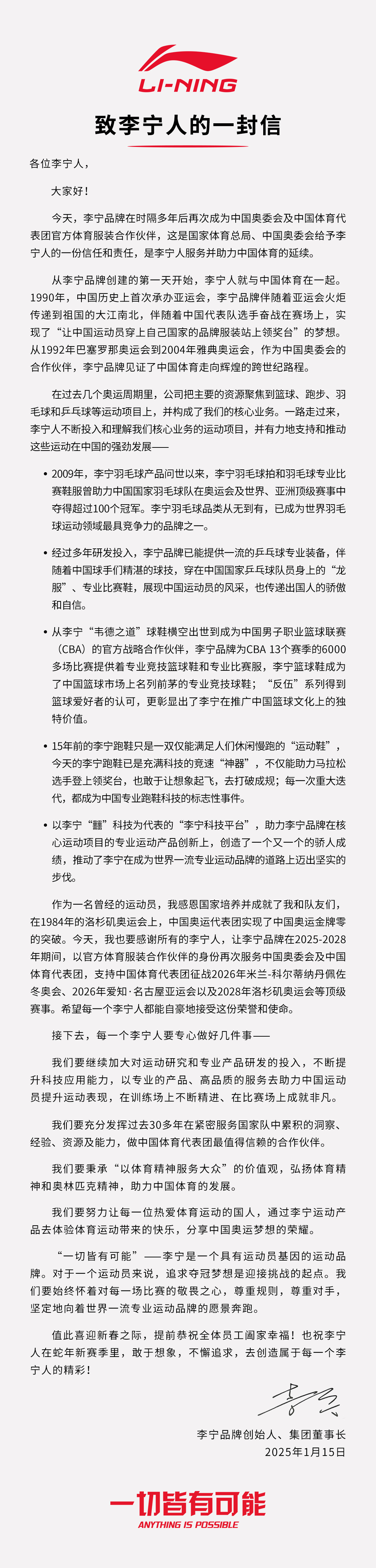 在信中,李寧先是對(duì)“所有李寧人”表示感謝,并指出,2025至2028年期間,李寧品牌將支持中國體育代表團(tuán)征戰(zhàn)2026年米蘭——科爾蒂納丹佩佐冬奧會(huì)、2026年愛知·名古屋亞運(yùn)會(huì)以及2028年洛杉磯奧運(yùn)會(huì)等頂級(jí)賽事。