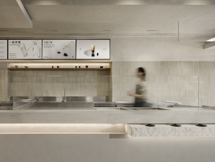 在門(mén)店內(nèi)院壩式社交帶來(lái)的熱鬧中,喜茶以克制冷靜的淺灰微水泥墻面搭配原木裝飾,在一冷一暖之間,還原院壩環(huán)境中自然肌理的質(zhì)樸與平靜。