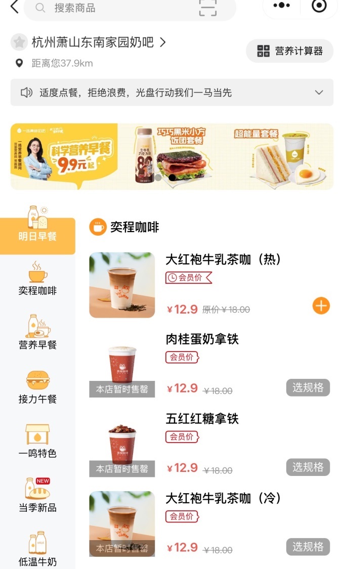 另?yè)?jù)一鳴真鮮奶吧官方小程序顯示,奕程咖啡售有奶咖、美式、茶咖、果咖等22款產(chǎn)品。除了經(jīng)典咖啡產(chǎn)品,還有“棗奶牛乳咖啡”“肉桂蛋奶拿鐵”“五紅紅糖拿鐵”等創(chuàng)新產(chǎn)品,價(jià)格在9.9元-18元/杯不等,奶咖會(huì)員價(jià)格能優(yōu)惠到12.9元/杯。