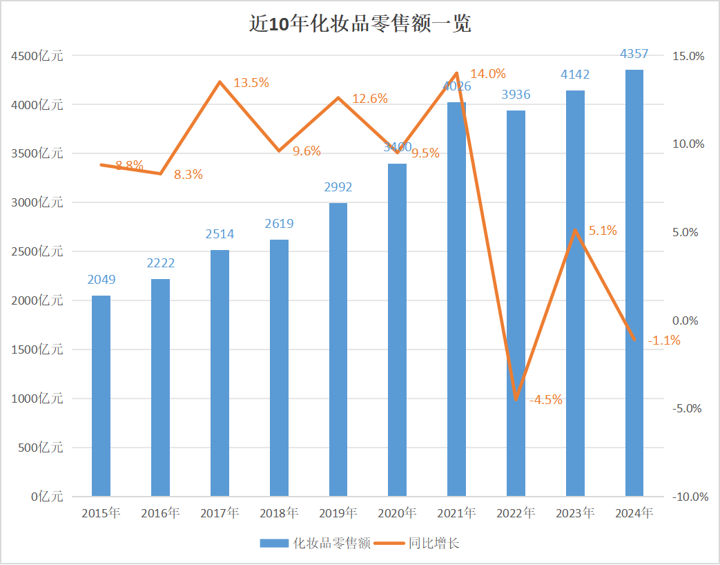 值得注意的是,2024年化妝品零售額為4357億元,比2023年的4142億元有所增加,但為何統(tǒng)計(jì)結(jié)果卻顯示為下降?
