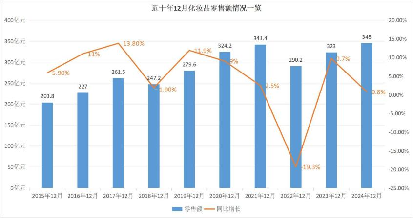 從增幅來看,2022年之前大多數(shù)年份的12月化妝品零售額均增幅較為顯著。比如,2017年12月、2019年12月,增幅分別為13.8%、11.9%。然而,2022年12月,化妝品零售額同比大幅下滑19.3%,創(chuàng)下近10年的最大降幅。到2024年12月,盡管零售額同比增長(zhǎng)0.8%,但這是近10年內(nèi)除2022年外的最低增速。