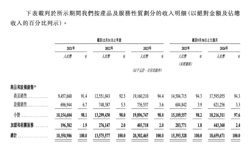 2024年前9個(gè)月,蜜雪冰城的加盟和相關(guān)服務(wù)收入為4.4億元,僅占總營(yíng)收的2.4%;向加盟商銷(xiāo)售設(shè)備的收入約為6.2億元,占總收入的3.3%,約95%的公司收入,其實(shí)是來(lái)自向加盟商銷(xiāo)售物料(包含糖、奶、茶、咖、果、小料等材料),收入約為176億元。