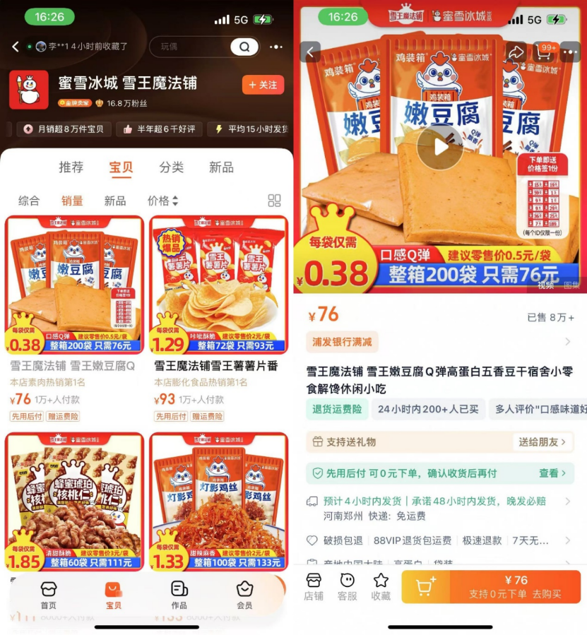此外,雪王還在淘寶開(kāi)設(shè)了“雪王魔法鋪”,銷(xiāo)售茶系列、口袋零食系列、咖啡系列、杯子系列、文創(chuàng)周邊系列等系列產(chǎn)品,目前該店銷(xiāo)量最高的嫩豆腐干,已售出8萬(wàn)+份。