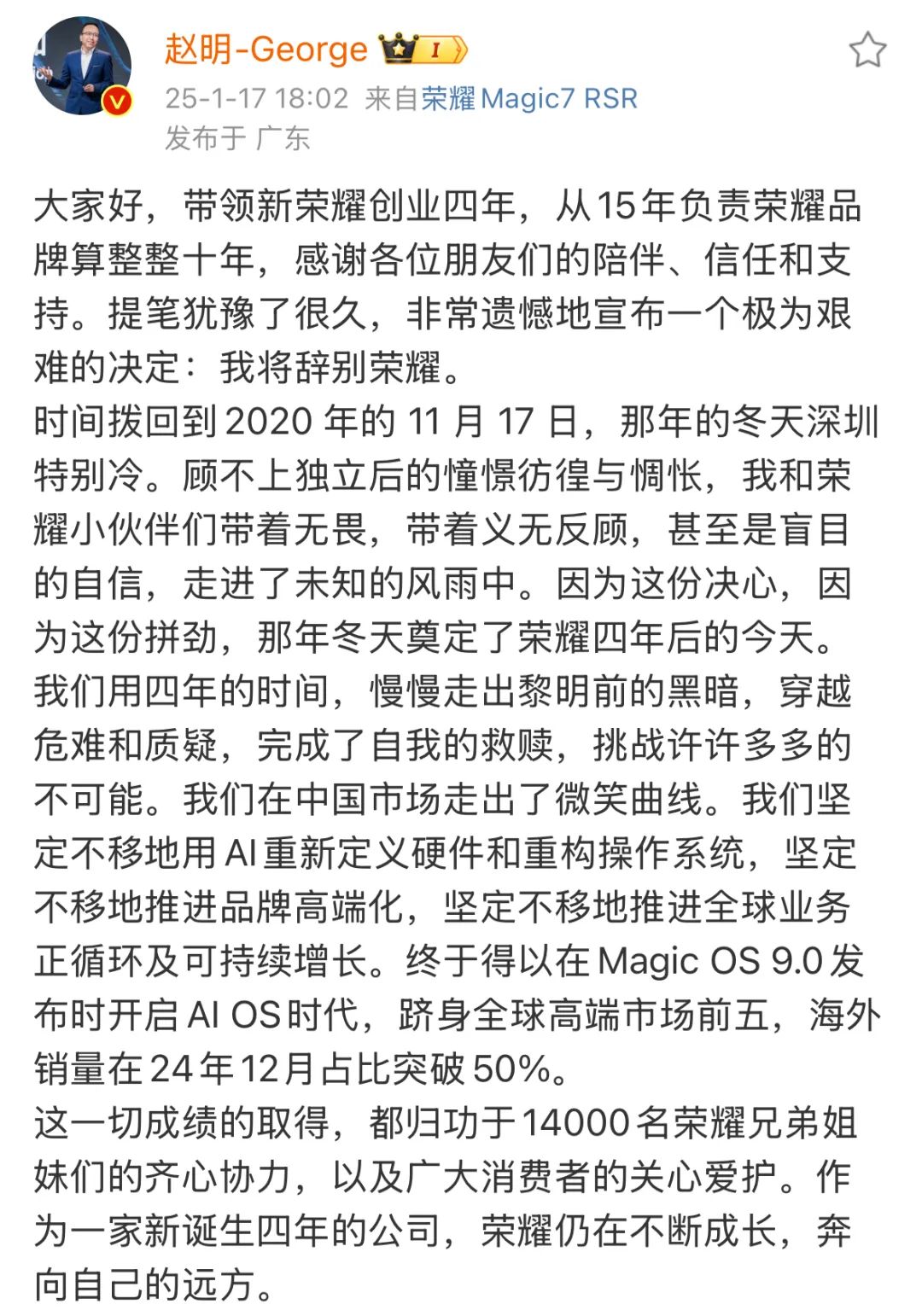 在發(fā)布離職長(zhǎng)文之前,趙明的上一條微博停留在1月12日,他只是轉(zhuǎn)發(fā)了一條為榮耀Magic7影像宣傳的微博,轉(zhuǎn)發(fā)文案也很簡(jiǎn)單,“極致、純粹之美”。