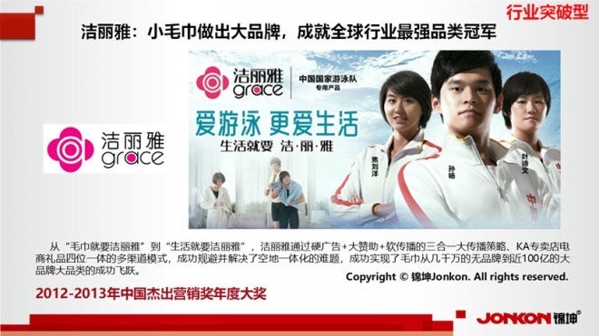在行業(yè)突破型的案例中,潔麗雅是榜上有名的,他通過小毛巾做出大品牌,成就全球行業(yè)最強(qiáng)品類冠軍。