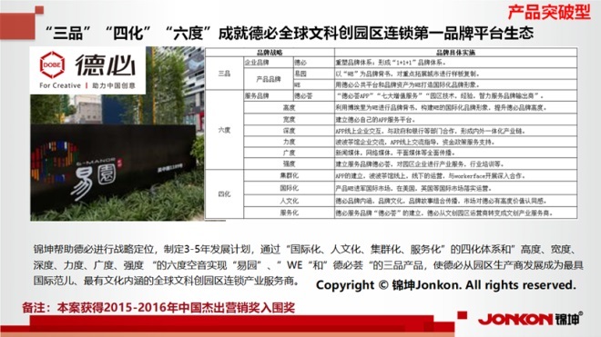 在錦坤的指導(dǎo)、輔導(dǎo)和督導(dǎo)下,德必是最早提出和踐行“品牌連鎖化”“城市更新化”“文科創(chuàng)一體化”模式的企業(yè)之一,通過老舊建筑改造和城市更新項(xiàng)目,為社會(huì)貢獻(xiàn)了第一份力量。德必集團(tuán)在城市更新領(lǐng)域積累了豐富的經(jīng)驗(yàn),打造了多個(gè)成功的園區(qū)品牌,如“德必易園”、“德必WE”、“德必運(yùn)動(dòng)LOFT”等系列園區(qū)品牌。