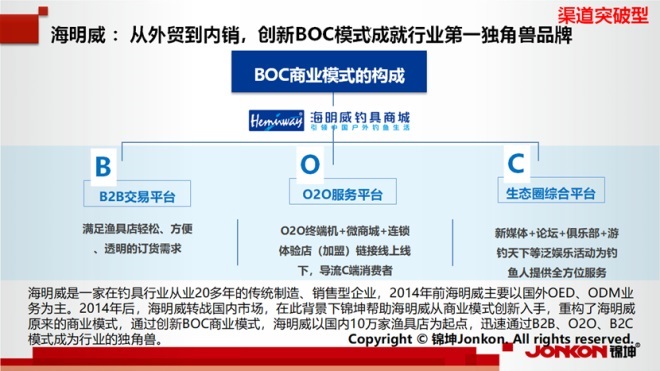 海明威通過創(chuàng)新的BOC商業(yè)模式,成功整合了業(yè)務(wù)、組織和客戶資源,實(shí)現(xiàn)了從傳統(tǒng)制造到品牌的華麗轉(zhuǎn)變,這種模式不僅提升了品牌的市場(chǎng)認(rèn)知度,還增強(qiáng)了品牌的市場(chǎng)競(jìng)爭(zhēng)力。公司以國(guó)內(nèi)10萬家漁具店為起點(diǎn),迅速通過B2B、O2O、B2C模式成為行業(yè)的獨(dú)角獸。