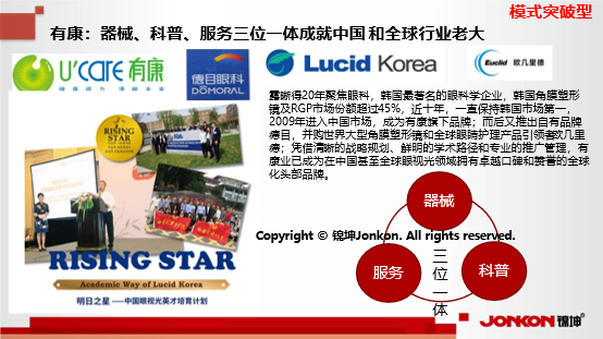 露晰得20年聚焦眼科,韓國(guó)最著名的眼科學(xué)企業(yè),韓國(guó)角膜塑形鏡及RGP市場(chǎng)份額超過45%,近十年,一直保持韓國(guó)市場(chǎng)第一,2009年進(jìn)入中國(guó)市場(chǎng),成為有康旗下品牌;而后有康又推出自有品牌德目,并購(gòu)世界大型角膜塑形鏡和全球眼睛護(hù)理產(chǎn)品引領(lǐng)者歐幾里德;憑借清晰的戰(zhàn)略規(guī)劃、鮮明的學(xué)術(shù)路徑和專業(yè)的推廣管理,有康業(yè)已成為在中國(guó)甚至全球眼視光領(lǐng)域擁有卓越口碑和贊譽(yù)的全球化頭部品牌。