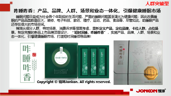 錦坤從細(xì)分人群、特地場(chǎng)景、消費(fèi)訴求等層面考慮,重新定義產(chǎn)品,定位品牌,卡位人群,占位場(chǎng)景,制定完整的新品上市品牌頂層設(shè)計(jì),“短時(shí)深睡,咋睡咋香”,實(shí)施產(chǎn)品、品牌、人群、場(chǎng)景和業(yè)態(tài)一體化,引爆健康睡眠市場(chǎng),打造短時(shí)深睡領(lǐng)導(dǎo)品牌!