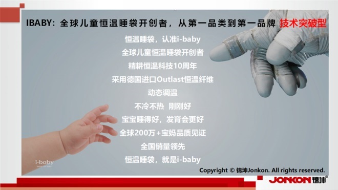 i-baby專注于嬰幼兒恒溫睡眠領(lǐng)域,采用德國(guó)進(jìn)口Outlast恒溫纖維技術(shù),研發(fā)出能夠動(dòng)態(tài)調(diào)溫的兒童恒溫睡袋,這項(xiàng)技術(shù)最初由美國(guó)國(guó)家航空航天局(NASA)研發(fā),用于保護(hù)宇航員在太空中免受氣溫驟變的傷害。利用此技術(shù),i-baby開發(fā)了從睡袋到睡衣、睡枕、睡被等多元化的恒溫睡眠產(chǎn)品,形成了強(qiáng)大的產(chǎn)品矩陣,滿足不同年齡段兒童的睡眠需求。