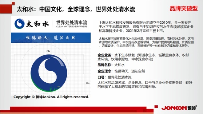 太和水作為品牌突破型的代表,在品牌出海方面的舉措表現(xiàn)得尤為突出。公司專注于水下生態(tài)修復(fù)技術(shù)的研發(fā),并擁有自主知識(shí)產(chǎn)權(quán),成為水生態(tài)領(lǐng)域的領(lǐng)軍企業(yè)。太和水以“惟德動(dòng)天,道法自然”為企業(yè)理念,以“世界處處清水流”為口號(hào),這些品牌元素緊密關(guān)聯(lián)企業(yè)業(yè)務(wù),有效體現(xiàn)了太和水的品牌定位和形象。