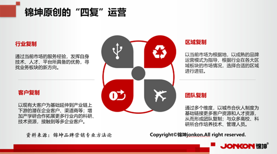 上文中提到,“本地化”是品牌出海的關(guān)鍵問題。即使品牌沒有更換賽道,面臨不同國(guó)家的市場(chǎng)經(jīng)營(yíng)環(huán)境,企業(yè)想要實(shí)現(xiàn)品牌出海真正的落地生根,離不開行業(yè)深入、客群把控、區(qū)域拓展、團(tuán)隊(duì)架構(gòu)四個(gè)因素,也就是錦坤原創(chuàng)設(shè)計(jì)并一直倡導(dǎo)和力行的行業(yè)復(fù)制、區(qū)域復(fù)制、客戶復(fù)制和團(tuán)隊(duì)復(fù)制的“四復(fù)”營(yíng)銷底層運(yùn)營(yíng)。
