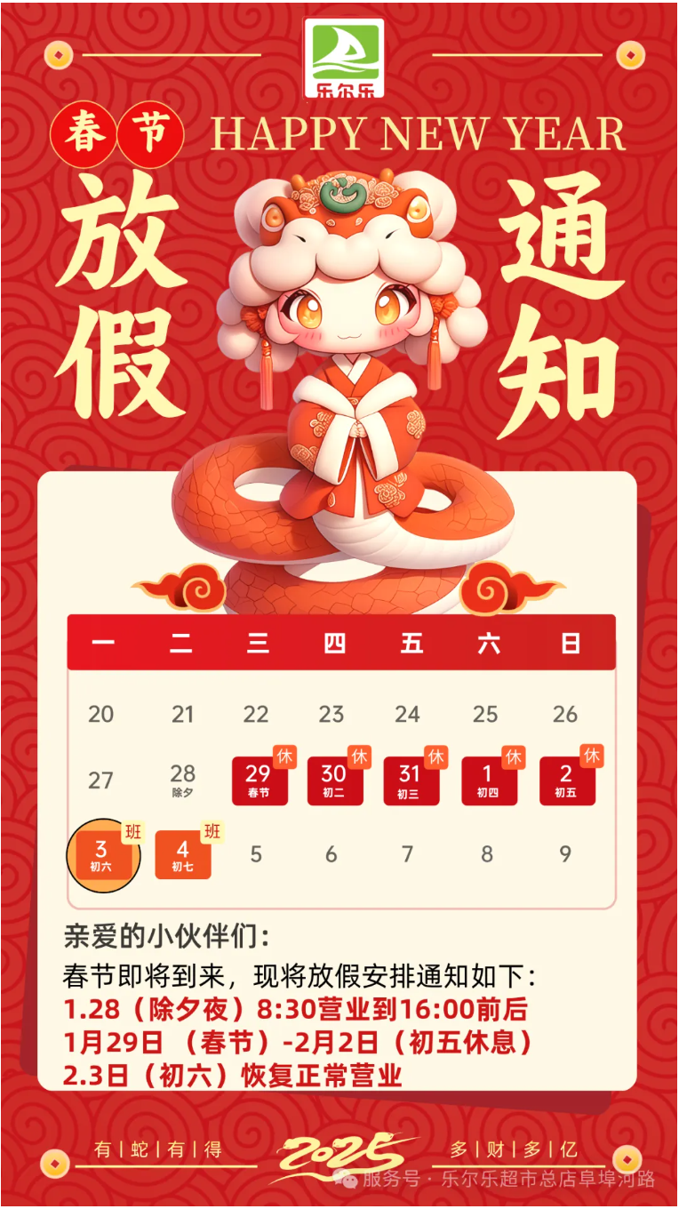 樂爾樂門店享有自主決定權,部分門店如阜埠河路店宣布放假休息5天、樂爾樂總部上河國際倉店,將于2025年1月27日(農(nóng)歷臘月二十八)至2025年2月4日(農(nóng)歷正月初七)正式放假,共計9天。
