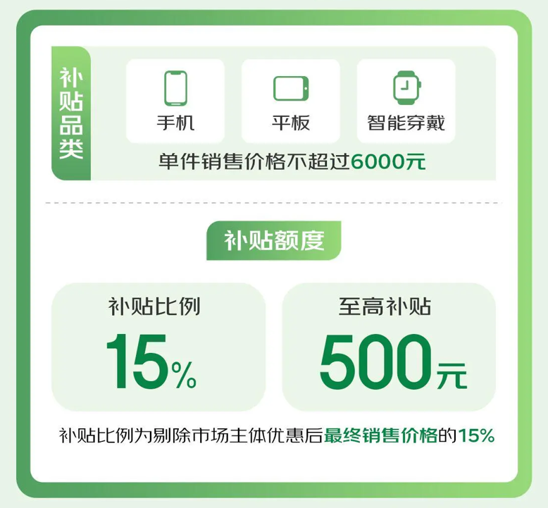 消費(fèi)者在京東APP搜索“3C國(guó)補(bǔ)”即可進(jìn)入活動(dòng)會(huì)場(chǎng),購(gòu)買手機(jī)、平板、智能手表(手環(huán))3類數(shù)碼產(chǎn)品(單件銷售價(jià)格不超過(guò)6000元),按產(chǎn)品銷售價(jià)格的15%享受補(bǔ)貼,每位消費(fèi)者每類產(chǎn)品可享1件補(bǔ)貼,每件補(bǔ)貼不超過(guò)500元,3類產(chǎn)品合計(jì)每人至高可省1500元。