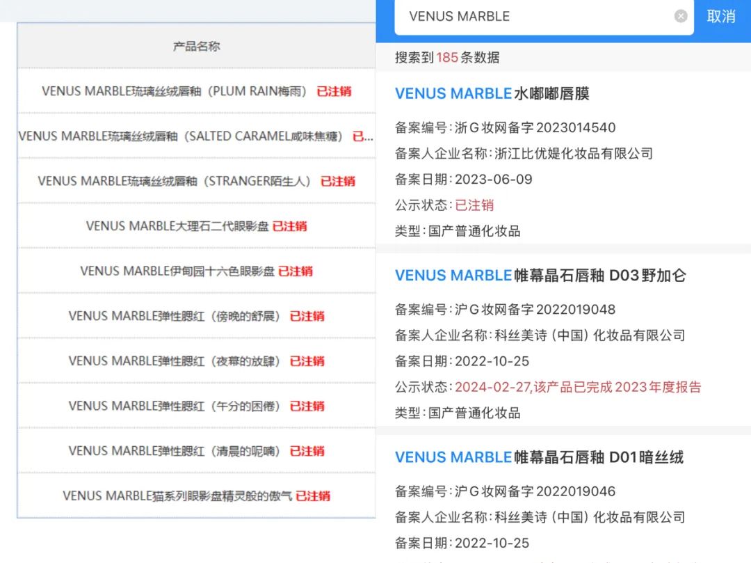 且從國家藥監(jiān)局備案信息查詢來看,由威蔓化妝品備案的VENUS MARBLE產品均已注銷。