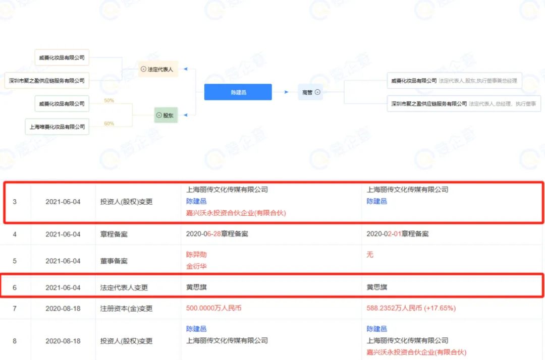 愛企查顯示,VENUS MARBLE創(chuàng)始人持股的上海唯蔓化妝品有限公司(注:現(xiàn)已注銷),法定代表人系INTO YOU創(chuàng)始人黃思旗。