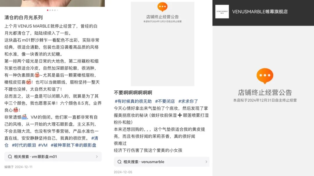 日前,在小紅書上多名網友發(fā)布筆記稱,新銳國貨彩妝VENUS MARBLE(中文名:帷幕)在去年12月底關閉了官方旗艦店,其表示“非常遺憾、他們家一直都非常有自己的風格,不會隨大流,也沒有快節(jié)奏營銷,產品水準也一直在線”、“經濟下行傷害了我這個愛美的小女孩”。