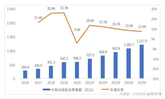 據(jù)中金企信統(tǒng)計數(shù)據(jù),2017年中國內地彩妝零售額達345.6億元,年增長率為21.4%;而2017-2019年是國內彩妝市場零售額增速最快的三年,年增速在20%-35%之間。