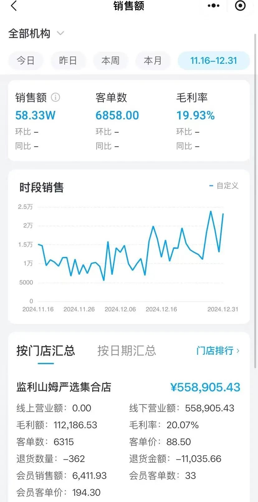 但監(jiān)利有“山姆”,且監(jiān)利的“山姆”也賣(mài)爆了。2024年11月16日,監(jiān)利“山姆”正式開(kāi)業(yè),截至2024年12月31日,其銷售額超過(guò)58萬(wàn)元,客單數(shù)為6858單,平均毛利率接近20%。