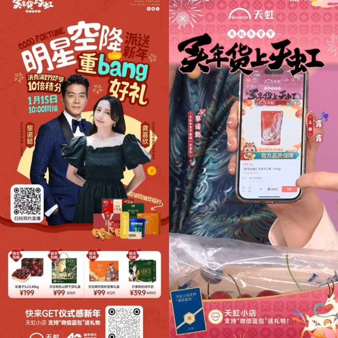 面對春節(jié)這一消費旺季,天虹將“微信藍包”無縫融入節(jié)日消費場景中——在微信小店上線與春節(jié)送禮場景高度適配的商品,如車厘子、敦煌聯(lián)名禮盒等,同時開展“明星一日店長”年貨送禮主題直播,結(jié)合自身私域優(yōu)勢及強大的會員基礎(chǔ)進行全量推廣。