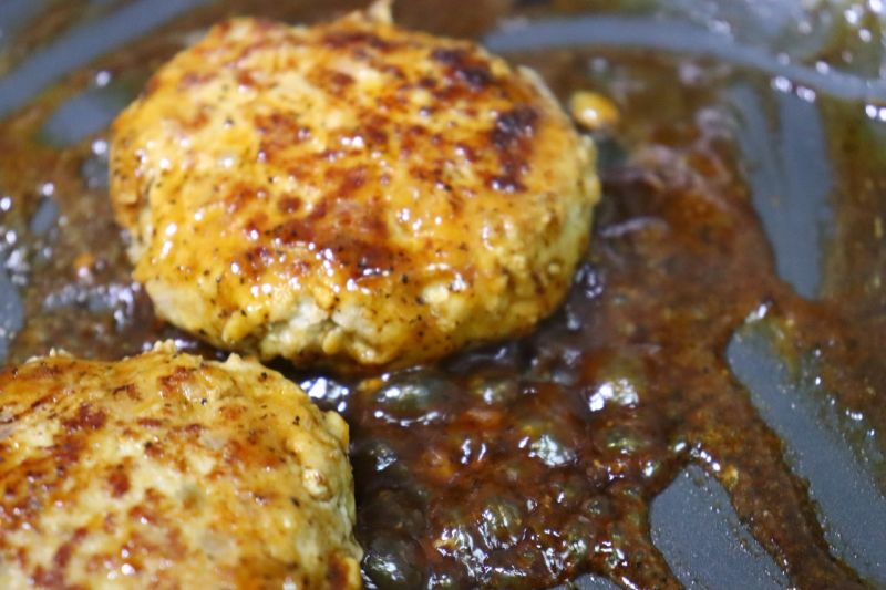 煎好的肉餅放在白米飯上,再蓋上一顆溫泉蛋或者生食蛋,搭配自己喜歡的各式醬料,一碗漢堡飯就制作完成了。
