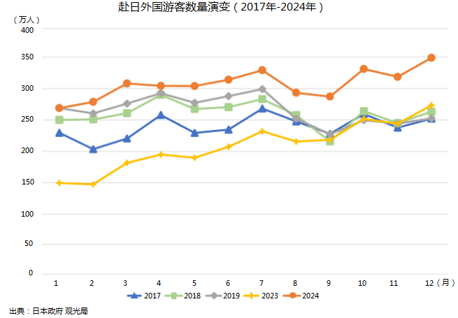 從以上數(shù)據(jù)可以看出訪問日本的海外游客消費(fèi)總額,在2022年以后呈現(xiàn)爆發(fā)式增長(zhǎng),遠(yuǎn)遠(yuǎn)超過2019年。除掉疫情因素影響的三年(2020年至2022年)不做分析比較以外,人均消費(fèi)在2022年特殊時(shí)期達(dá)到23.5萬日元(約1.1萬人民幣)以后,2024年為22.7萬日元(約1萬人民幣),有所降低,但遠(yuǎn)遠(yuǎn)超過2019年的15.9萬日元(約7444人民幣)的水平。