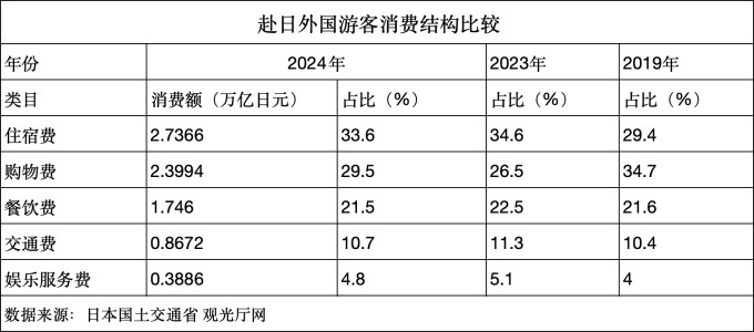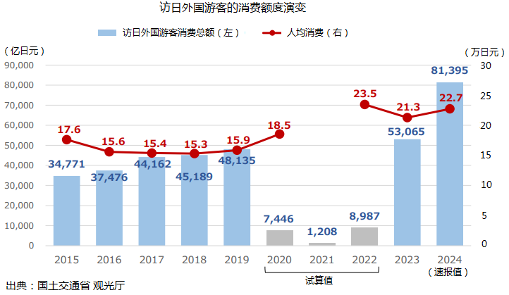 2025年1月15日,日本國(guó)土交通省觀光廳發(fā)布海外入境游客消費(fèi)動(dòng)向調(diào)查報(bào)告。2024年訪日外國(guó)游客消費(fèi)總額8.1395萬億日元(約3813億人民幣),達(dá)到歷史新高。按同口徑比較,比2023年增長(zhǎng)53.4%,比2019年增長(zhǎng)69.1%。外國(guó)游客人均旅行支出為22.7萬日元(約1萬人民幣),比2023年增長(zhǎng)6.8%,比2019年增長(zhǎng)43.3%。