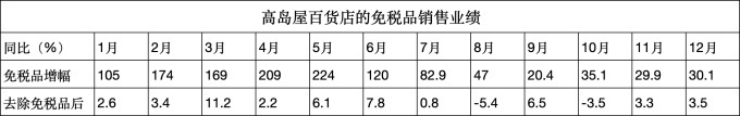 高島屋百貨店的免稅品銷售額實(shí)現(xiàn)歷史新高,采取措施包括開辟海外會(huì)員專項(xiàng)服務(wù),全年各月業(yè)績(jī)表現(xiàn),免稅品業(yè)績(jī)與其它方面的業(yè)績(jī)?cè)鲩L(zhǎng)幅度有巨大差距。