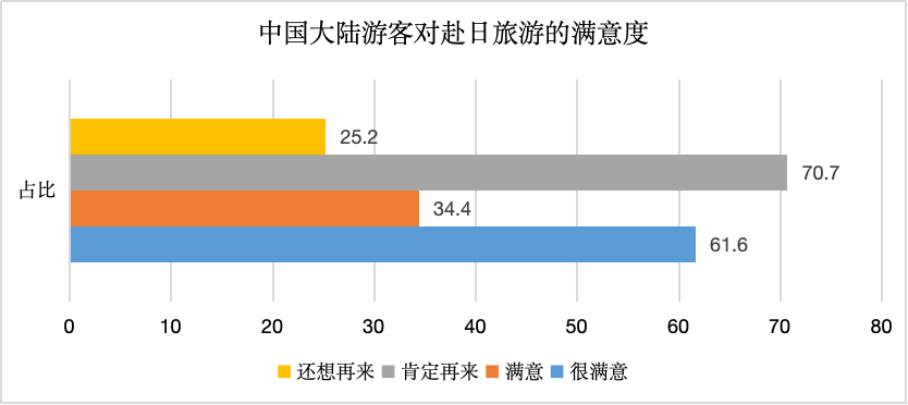 第五、消費(fèi)滿意度很高。表示很滿意的占62.6%,滿意的占34.4%,合計(jì)97%,肯定再來70.7%,想要再來25.2%,整體滿意傾向很高,在國(guó)內(nèi)組織商業(yè)滿意度調(diào)查,真實(shí)數(shù)據(jù)達(dá)不到這個(gè)水平。