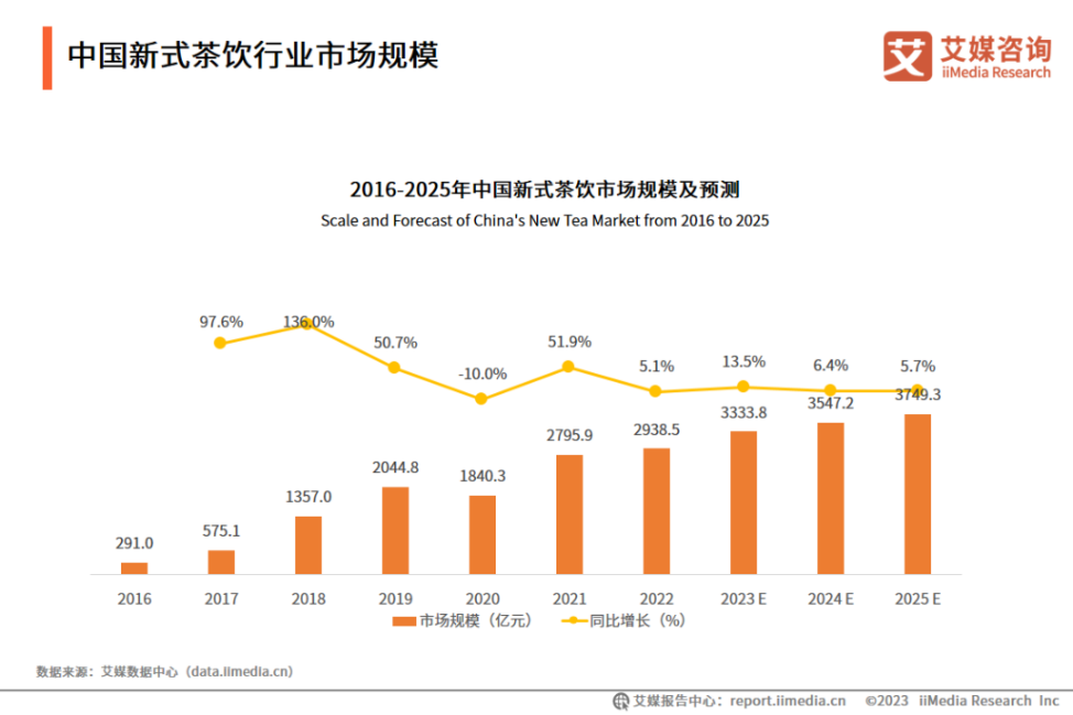 據艾瑞咨詢數據顯示,2017年至2021年,中國新茶飲市場規(guī)模從422億元攀升至1003億元,年復合增長率保持在20%以上。而根據預測,2023年至2025年間,行業(yè)增速將逐步放緩至13.4%、6.4%和5.7%。